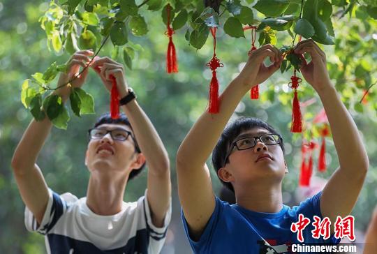 大学生们在校园内系上中国结祈愿和平。 李珂 摄
