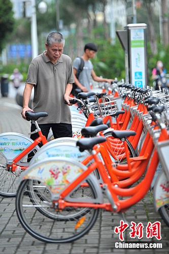9月7日,市民在广西南宁市双拥路一处公共自行车租赁站点取车出行。 中新社发 胡雁 摄
