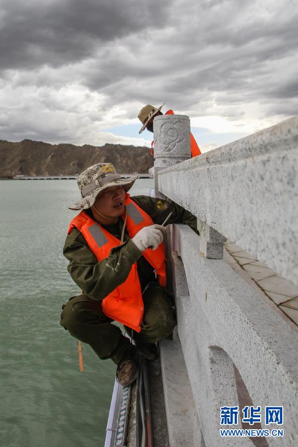 工人在拉萨河三号闸右岸的滨河公园里安装夜景景观灯(8月4日摄)。 新华社记者 陈益宸 摄