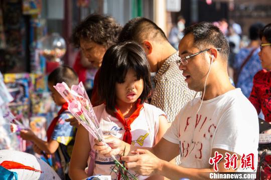 众多学生家长在福州市鼓楼实验小学门口选购塑料花。 李南轩 摄