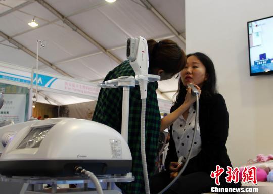 图为来自韩国的美容设备吸引民众试用。张玉雷 摄