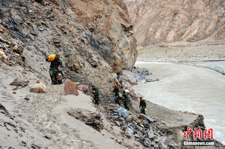 边防官兵徒步翻山越岭为辖区群众运送物资。截至目前,大同乡边防派出所官兵靠人背肩扛运送物资已达两个月。 彭新程 摄
