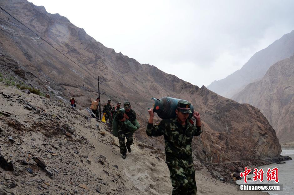 大同乡边防派出所官兵肩扛液化气罐等物资,徒步3公里运送物资。大同乡距塔什库尔干县有160余公里的山路,该路段经常遭受着强降雨、泥石流等自然灾害。道路一天不通,官兵们将持续人力徒步运送物资。 彭新程 摄