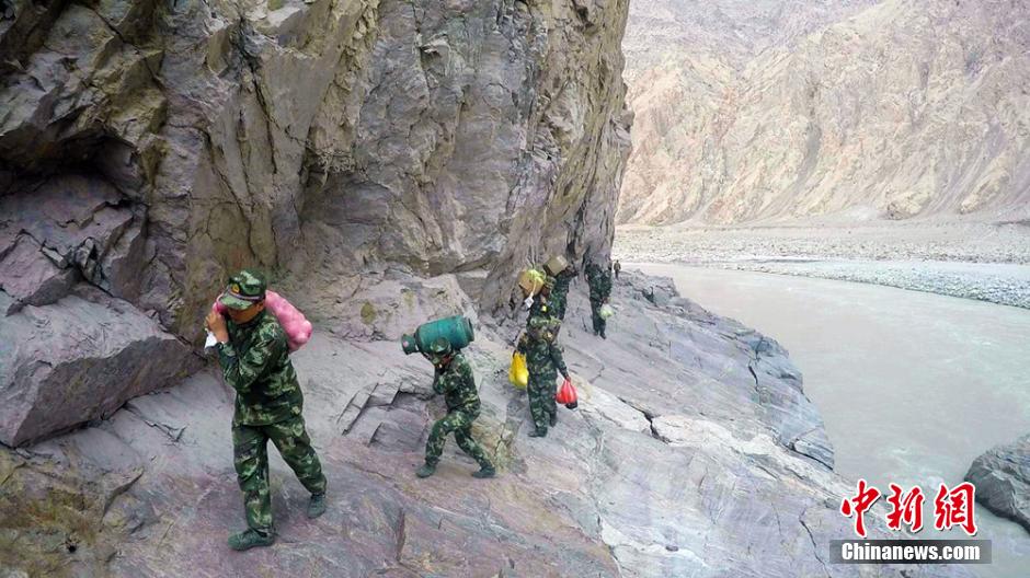 官兵们扛着液化气罐等物资艰难的走过一段段险路。 彭新程 摄