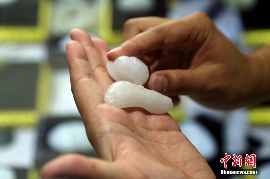 顾客在该交易中心内挑选昆仑玉挂件。昆仑玉主要产自昆仑山脉东缘,与和田玉同处一个矿带,现探明储量为3.9万吨。2008年奥运会成为“国玉”之后,身价几乎是一夜暴增。 孙睿 摄