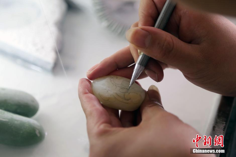 昆仑玉加工者正在雕刻昆仑玉。业内人士称,昆仑玉市场回暖或需3至5年。 孙睿 摄