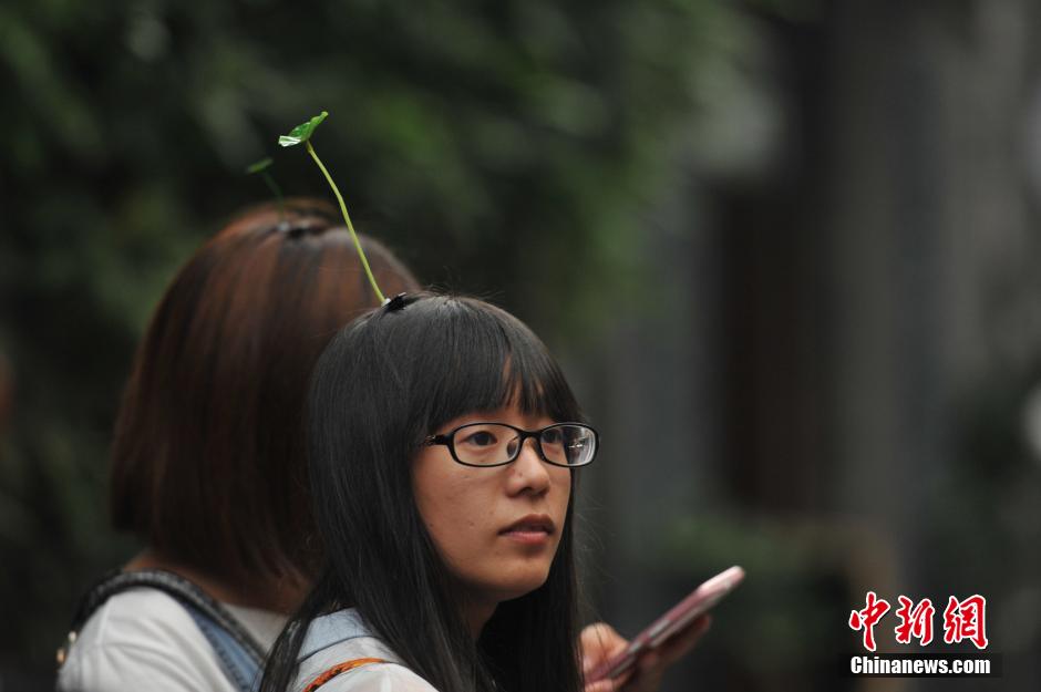9月15日,在成都宽窄巷子,游客戴上“豆芽花”发夹,头顶仿佛长出了新芽。“豆芽花”当地又叫“菜苗花”,形似一株破壤而出的菜苗,在成都宽窄巷子受到当地人的宠爱后,随着游客的推波和网络助澜,一夜之间风靡全国。 张浪 摄
