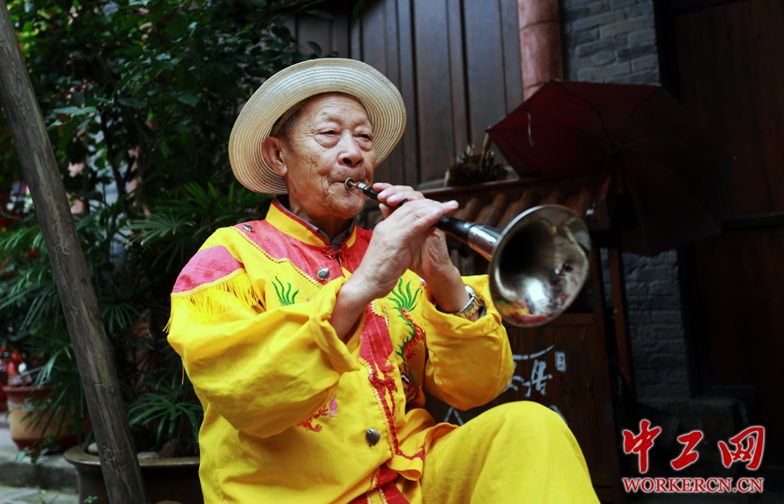安居自古水路交通发达,向上溯及川西,向下通达重庆、武汉、上海,舢板、安岳船往来穿梭,酒帮、盐帮、藻扎帮、染帮等行会林立,曾是长江上游重要的货物集散地。各行各业的手艺人,在这座古城就变得不可或缺了。扮铜人,说书人,做糕点这些行当,现在已经成为极其少见的民俗传承。图为年老的唢呐艺人正在演绎渝中地方曲调。(中工网记者 毛邓摄)