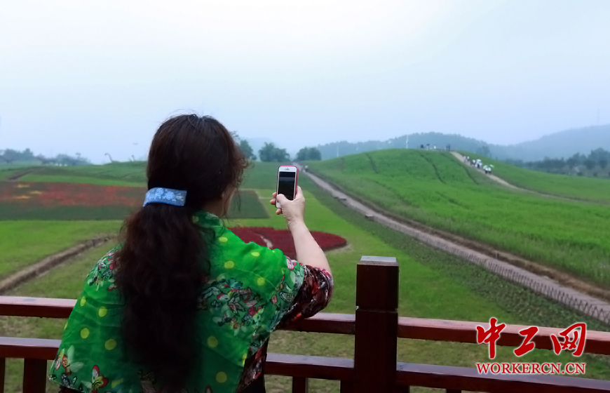 铜梁区现已完成黄桷门风情小镇和花海景区建设,建成风情商业街9600平米,培育彩色花卉品种100余种,形成以郁金香、熏衣草、格桑花、醉蝶花等为代表的四季花海核心区1300余亩。图为园区内的游客掏出手机拍摄花廊外美景。(中工网记者 毛邓摄)