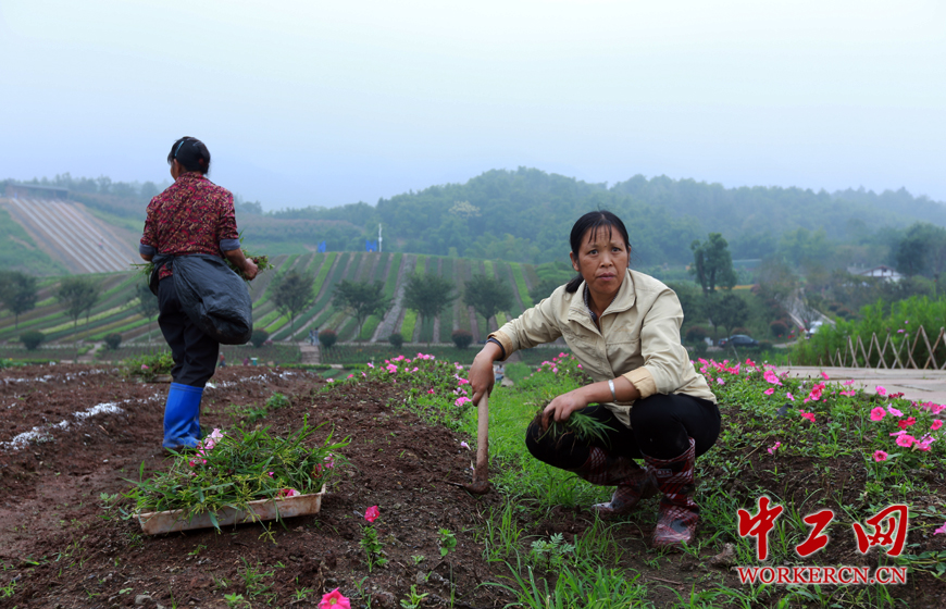 村里的李辉枝是这个坡头花卉种植的负责人,之前都在外务工,为了能照顾好考学的儿子,才选择回来。现在在园区内也担任着小组长的管理工作,每年能拿到的工资和出去务工相比也不差。现在她们紧抢着时间,争取能在这一礼拜就把工作做完,就可以去城里看孩子一起过中秋节了。(中工网记者 毛邓摄)