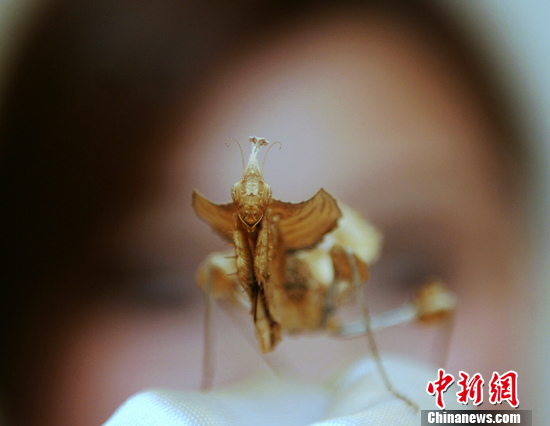 9月16日,产自马来西亚的“三角枯叶螳螂”在香港商场展出。香港有商场首次展出来自世界各地逾20种稀有珍贵的螳螂品种。 中新社发 谭达明 摄