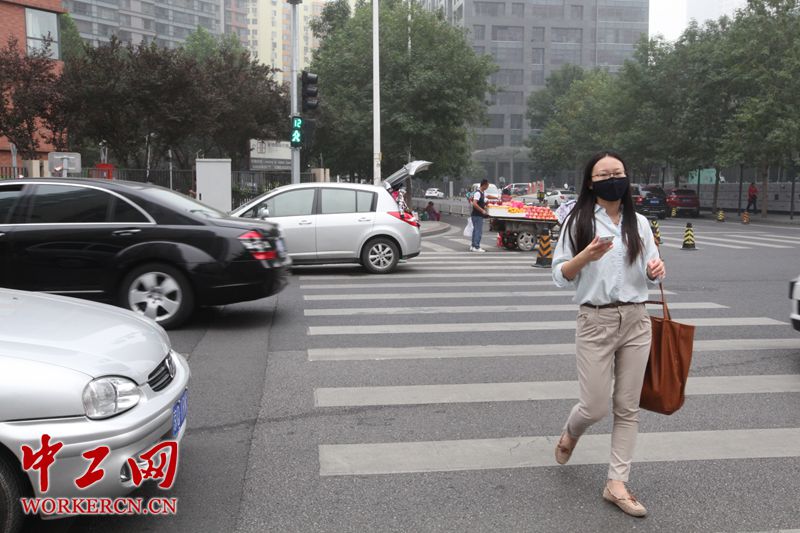 9月24日,北京,雾霾笼罩,能见度低,市民戴口罩出行。 中工网 张起晨摄