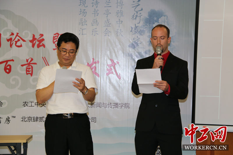 美籍华人、影视投资人王翰锐先生(左)英文朗诵陆地教授诗词《2013年元旦感怀》。(王晓渔 郭士玉)