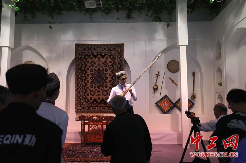 《在祖国的怀抱中──新疆维吾尔自治区成立60周年成就展》于9月20日在北京民族文化宫开幕。新疆维吾尔自治区成立60周年成就展以“在祖国的怀抱中”为主题﹐分为“成就篇?奋进的新疆”“惠民篇?幸福的新疆”“风采篇?和谐的新疆”“展望篇?希望的新疆”等板块。展览通过700多张图片﹑200多件实物﹑40多幅图表以及生动新颖的多媒体演示﹐充分展示了在党中央的亲切关怀和全国人民的大力支援下﹐新疆各族人民团结和谐﹑艰苦奋斗﹑奋发有为的精神风貌﹐充分展现了新疆维吾尔自治区成立60年来﹐特别是第二次中央新疆工作座谈会以来﹐自治区在经济﹑政治﹑文化﹑社会﹑生态文明和党的建设等方面取得的重大成就。   中工网记者   张起晨摄