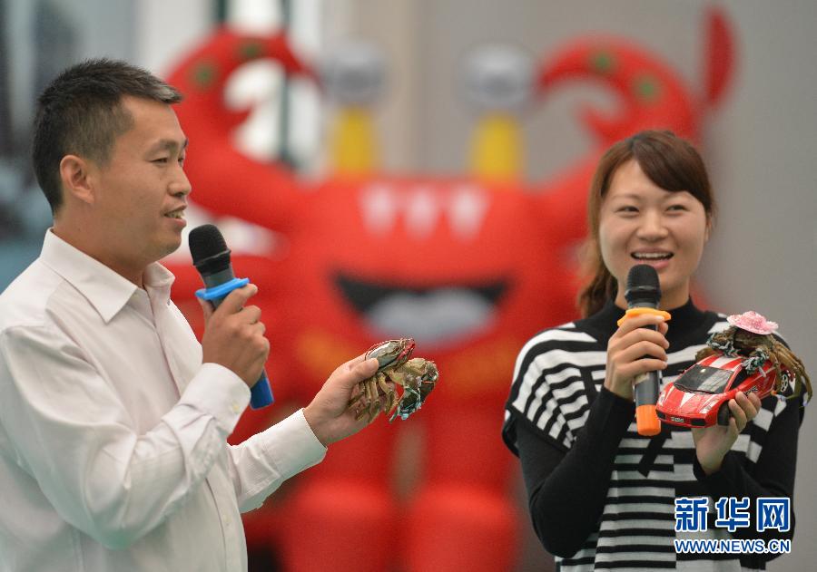 10月7日,在江苏省洪泽县,参赛选手表演“蟹博士求爱记”。当日,在洪泽湖畔的江苏省洪泽县文化活动中心,第十届江苏洪泽湖国际大闸蟹节重要组成部分的“洪泽湖大闸蟹模特大赛”有趣上演。丰收的蟹农将“壳青、肚白、毛黄、膏肥”代表洪泽湖大闸蟹特色的“螃蟹模特”带到现场,通过居民、学生创意的描绘妆扮,进行萌态十足的蟹模比赛,让更多的人们分享丰收的喜悦。洪泽县是洪泽湖大闸蟹主产区,养殖大闸蟹面积约12万亩,所产的大闸蟹远销各地。 新华社发(周洪明 摄)