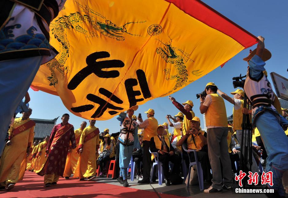 10月14日,来自马来西亚、荷兰、台湾、香港等国家和地区的1000余名海内外客属乡亲身披寓意“天下客裔一家亲”的黄马褂,共赴“客家祖地”福建宁化石壁村祭祖寻根,参加第21届世界客属石壁祖地祭祖大典。 中新社记者 吕明 摄