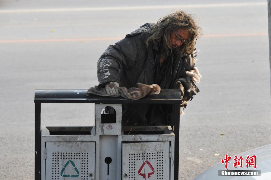 10月14日,辽宁沈阳,被网友赞为“沈阳最美”的拾荒老人在用自备的抹布擦拭路边的垃圾箱。一位老居民说,这个拾荒者至少在这里5年了,每天会在固定时间来擦垃圾桶和公交牌。孙昊声 摄