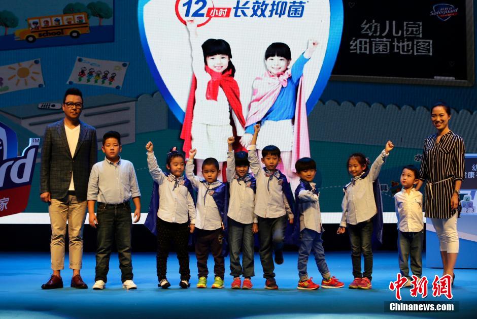 10月14日全球洗手日,演员郭涛携其子郭子睿(石头)出席洗手日活动。图为演员郭涛(左)携其子郭子睿(石头)出席洗手日活动。中新社记者 李慧思 摄