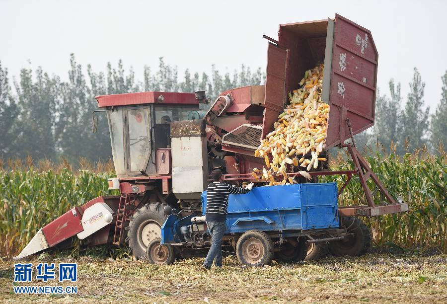 10月15日,盐山县聚农种植专业合作社农民在“渤海粮仓”示范田内收获最后一批玉米。截至10月15日,国家实施的粮食增产项目“渤海粮仓”河北沧州项目区秋收全部结束,项目区内的百余万亩玉米收获完毕,农民抓紧进行晾晒,确保颗粒归仓。新华社发(傅新春 摄)