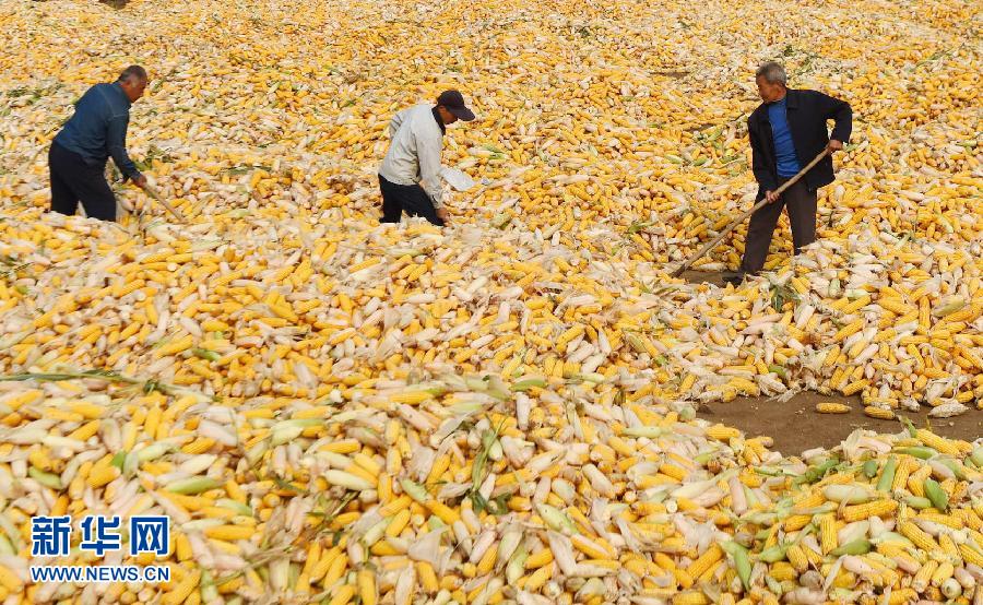 10月15日,盐山县聚农种植专业合作社农民在晾晒“渤海粮仓”示范田内收获的玉米。截至10月15日,国家实施的粮食增产项目“渤海粮仓”河北沧州项目区秋收全部结束,项目区内的百余万亩玉米收获完毕,农民抓紧进行晾晒,确保颗粒归仓。新华社发(傅新春 摄)