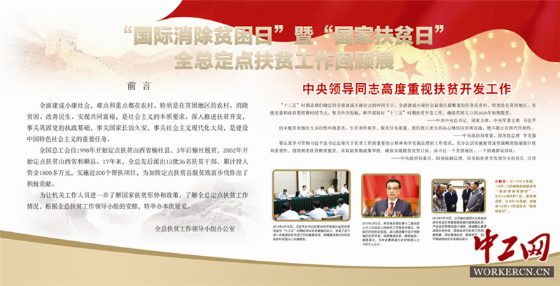 10月17日为国际消除贫困日,也是第二个国家扶贫日。为配合国务院扶贫办进行扶贫日的宣传,全总扶贫工作领导小组办公室举办了全总定点扶贫成果回顾展,介绍了中央领导同志关于扶贫工作的重要指示精神,回顾了全总领导关心支持定点扶贫工作、看望慰问扶贫队队员的情况,集中展示了全总历届扶贫队队员深入调研访民情、真抓实干谋发展、一心一意促脱贫的精神面貌和工作成绩,目的是让全总机关工作人员了解国家扶贫政策和全总定点扶贫工作,动员大家都来关心支持扶贫工作,凝聚起共同支持扶贫工作的合力。