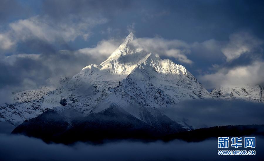 云南梅里雪山的缅茨姆峰在云层的掩映下显得神秘动人(10月15日摄)。云南梅里雪山是世界自然遗产“三江并流”的主要景观之一,常年笼罩在雪幕和云层里。清晨,阳光照在雪山顶上,形成绝美的“日照金山”奇观。梅里雪山的山峰气势磅礴、形态各异,吸引各地游客前来观奇揽胜。新华社记者 蔺以光 摄