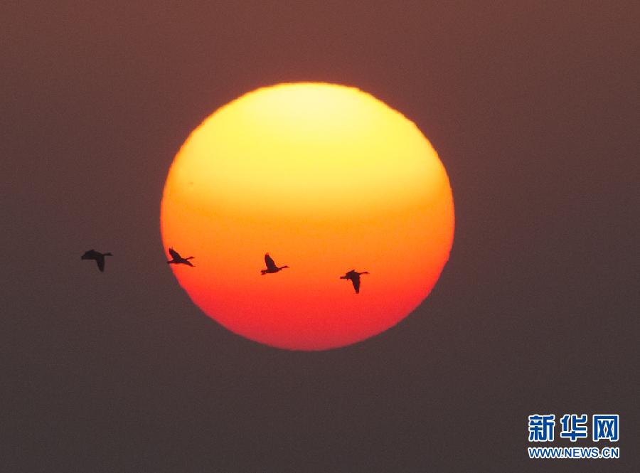 10月15日傍晚,鸟儿在江西鄱阳湖都昌候鸟保护区飞翔。随着气温的逐渐降低,大批候鸟飞往我国第一大淡水湖——鄱阳湖栖息。 新华社发(傅建斌 摄)
