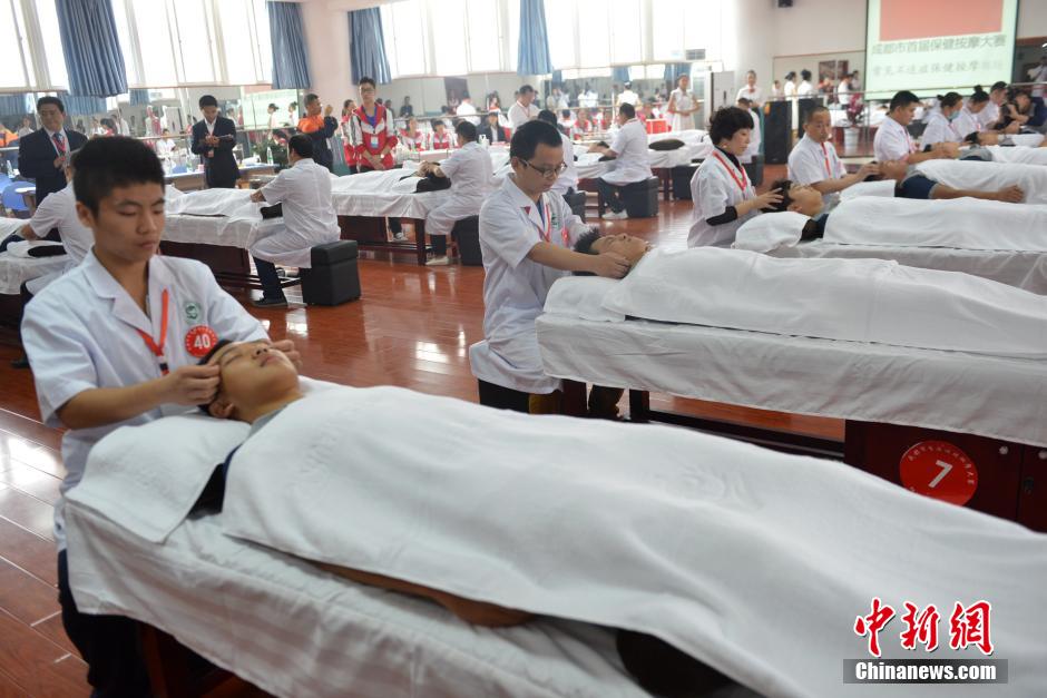 10月16日,成都市首届保健按摩技能大赛在四川省针灸学校(成都中医药大学附属医院针灸学校)举行,近百名保健按摩从业人员在保健按摩套路、常见不适症保健按摩等项目上展开比拼。 张浪 摄