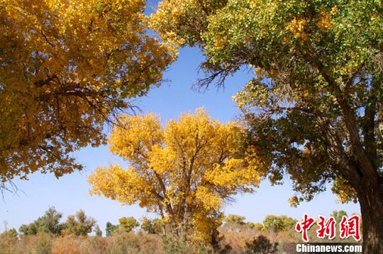金秋10月,坐落于塔克拉玛干南缘的新疆生产建设兵团三十八团,生长着大片的戈壁胡杨,茫茫戈壁上的胡杨林金黄一片,形态各异,湛蓝的天空与秋色的胡杨林相映相成,如诗如画,显得格外壮观美丽。
