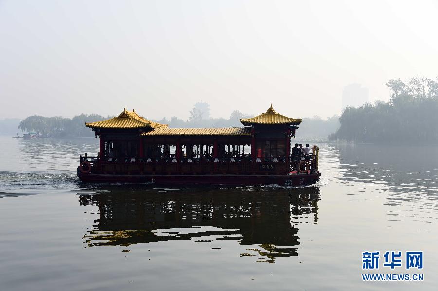10月16日,济南一艘画舫船在雾霾中前行。当日,山东省气象台发布霾黄色预警,包括省会济南在内的13个地市出现严重或重度霾。 新华社记者 郭绪雷 摄