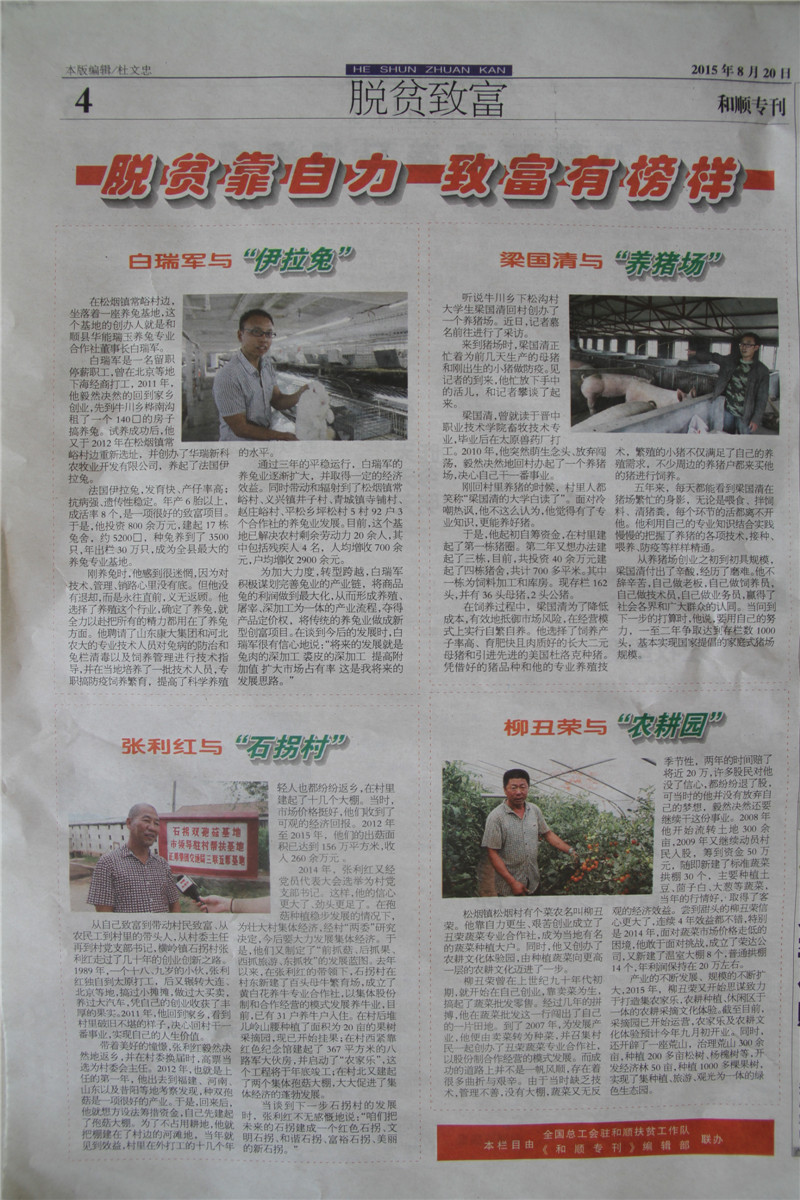 与《和顺专刊》合办“脱贫靠自力 致富有榜样”专栏,每期介绍四个投资不大、难度不高、可供借鉴的致富典型,激励贫困群众自立自强、摆脱贫困。