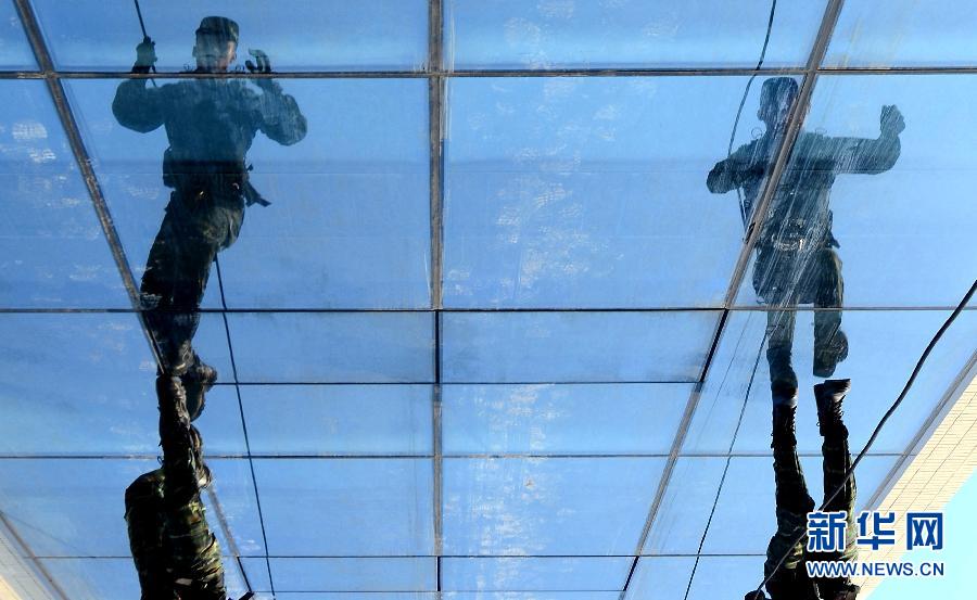 10月19日,特战队员在进行索降课目训练。仅凭一根绳索,纵身从高空跳下,到达目标窗口后,迅速破窗而入……这些常人眼里“飞檐走壁”的功夫,却是武警重庆总队七支队特战队员必备的基本功。训练中,特战队员们根据模拟任务进行高空侦察、突击掩护等小组协同战术,开展攀登、射击、索降、越障等应用课目,他们凭借着敏捷的身手、过硬的胆识以及高超的技艺被人们称为警营“蜘蛛侠”。新华社发(曹峰 摄)