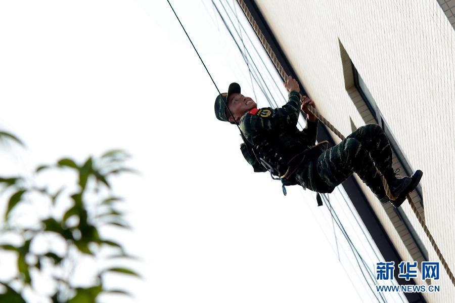 10月19日,特战队员在进行特种攀登课目训练。仅凭一根绳索,纵身从高空跳下,到达目标窗口后,迅速破窗而入……这些常人眼里“飞檐走壁”的功夫,却是武警重庆总队七支队特战队员必备的基本功。训练中,特战队员们根据模拟任务进行高空侦察、突击掩护等小组协同战术,开展攀登、射击、索降、越障等应用课目,他们凭借着敏捷的身手、过硬的胆识以及高超的技艺被人们称为警营“蜘蛛侠”。新华社发(曹峰 摄)