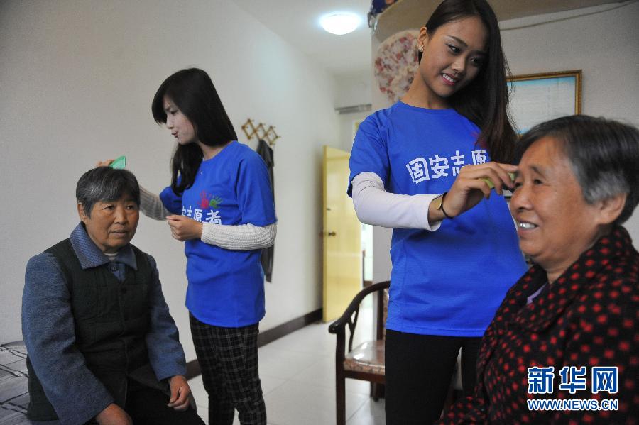 10月20日,两名志愿者在为敬老院里的老人梳头,和她们聊家常。 新华社记者鲁鹏摄
