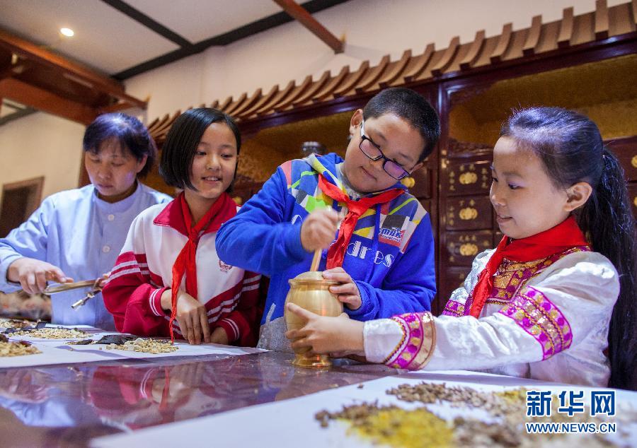 10月20日,内蒙古呼和浩特市玉泉区通顺街小学的学生在杏林堂中医院中药房学习捣药。 新华社发(丁根厚 摄)