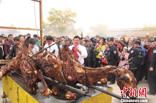 新疆巴楚2015年丝路之驿文化旅游节上,烧烤大师莫明·吾甫尔烤出700公斤烤全驼,刷新他此前的世界纪录。 朱景朝 摄