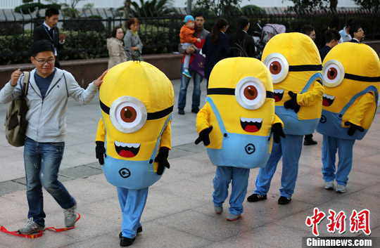 10月27日,一大拨小黄人出现在南京闹市,沿途行进与市民互动,萌萌哒的模样引发围观。中新社记者 泱波 摄