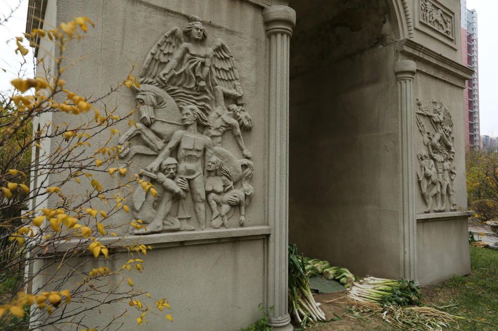图为“凯旋门”内晾晒的白菜、大葱等。