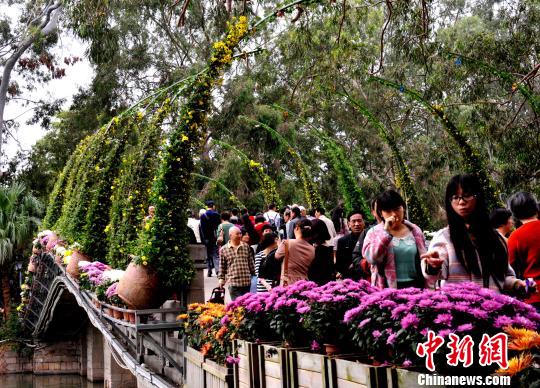 福州西湖公园内用菊花装扮的石桥美不胜收。 刘可耕 摄