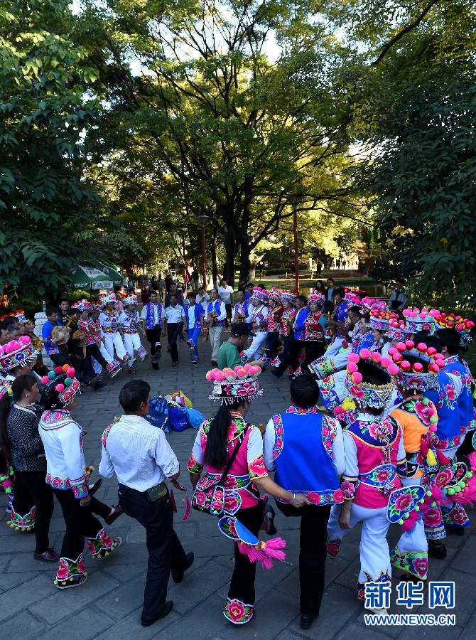 11月8日,一些少数民族群众和外地游客在云南省昆明市翠湖公园里跳舞。当日正值立冬,云南省昆明市天气清朗,阳光和煦。市民和游客纷纷来到市内的各大公园,享受冬日暖阳。 新华社记者 蔺以光 摄