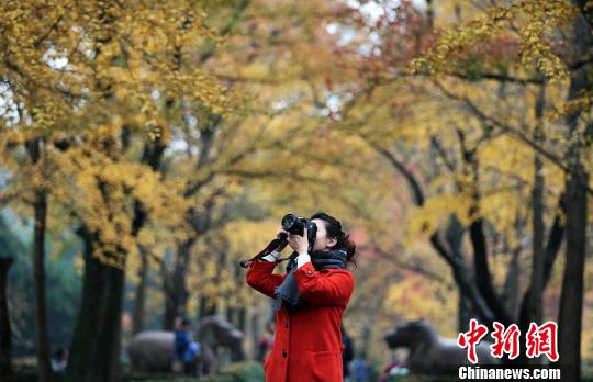 11月19日,游客和市民在南京明孝陵石象路上欣赏秋景。虽然时节已过立冬,但南京紫金山的“秋景”正在热烈上演,明孝陵、中山陵和灵谷寺等区域的金黄的银杏、艳红的枫香等各种彩叶树种陆续换上了五彩斑斓的色彩。