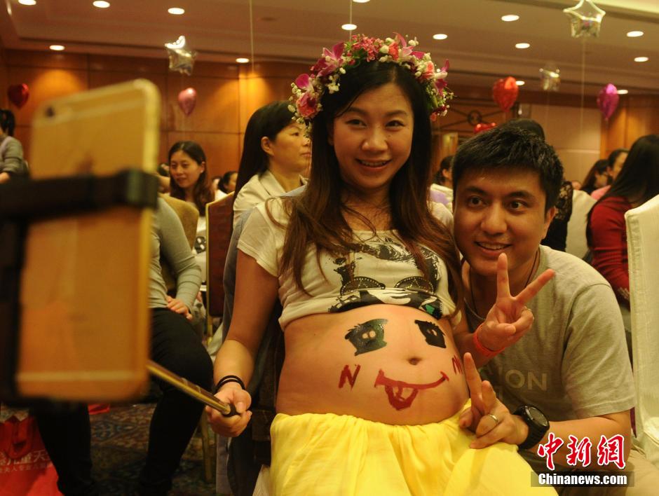重庆举办孕妈彩绘比赛 准爸爸在妻子肚皮上作画