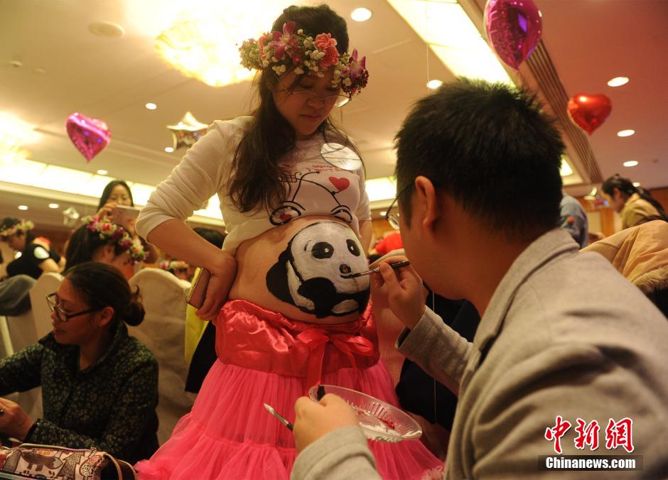 重庆举办孕妈彩绘比赛 准爸爸在妻子肚皮上作画