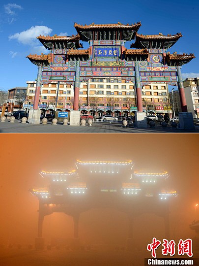 12月1日,呼和浩特大召寺广场的牌坊。(上图为12月1日下午拍摄,下图为11月29日晚拍摄)当日下午,呼和浩特雾霾消散,空气质量变好,一扫前几日的“雾霾锁城”。(拼版图片)中新社记者 刘文华 摄