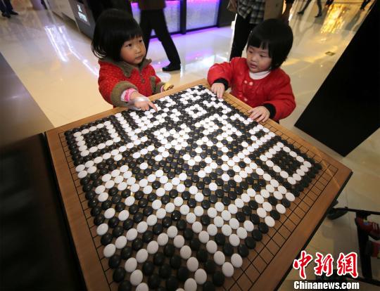 图为展出现场,用围棋拼出的二维码吸引小朋友眼球。 周毅 摄