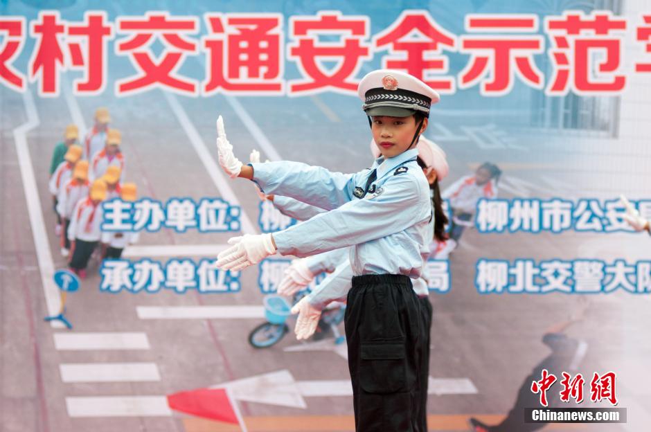 广西柳州小学生穿警服指挥交通