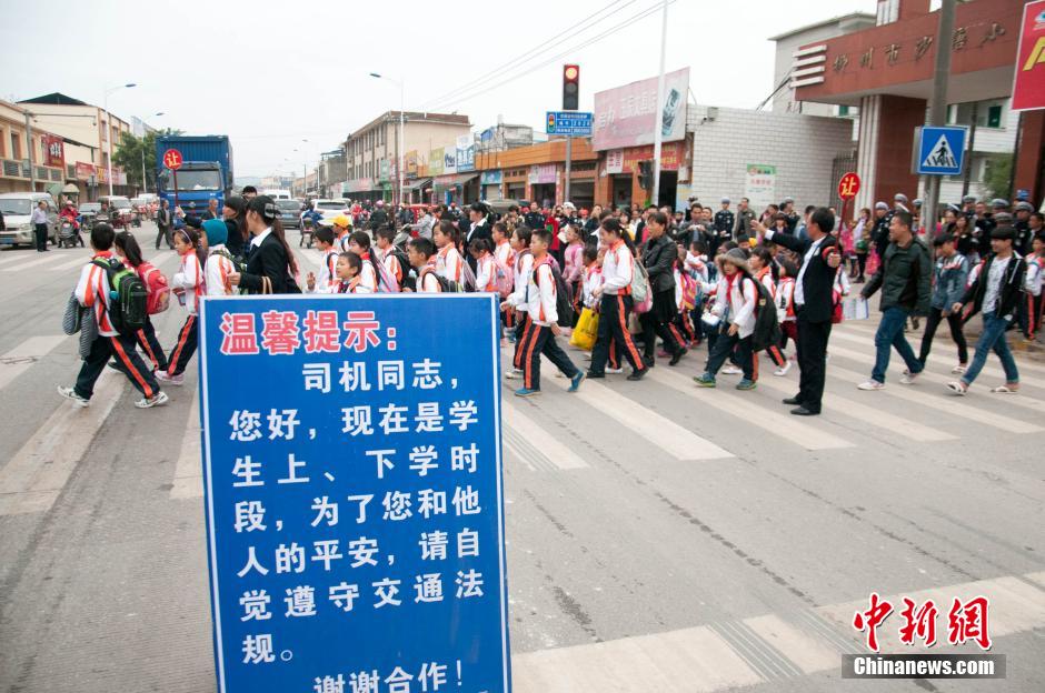 广西柳州小学生穿警服指挥交通