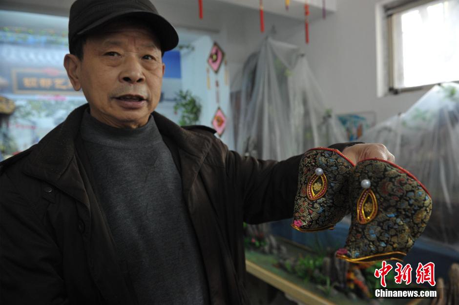 12月2日,武汉68岁老人黄茂才用泡沫雕刻的三寸金莲鞋。黄茂才从2008年开始潜心制作泡沫仿真工艺品,至今已完成上千件,涉及百姓日常的吃、穿、住、行等方面。工艺品制作需要经过选材、雕刻、砂纸打磨、刮灰、上色等7、8道工序。