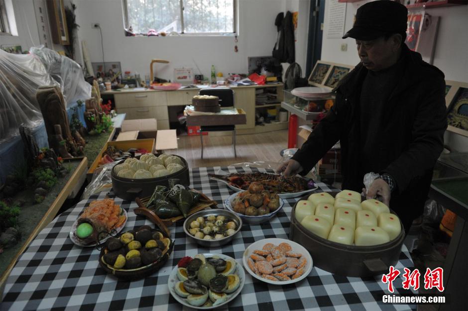 12月2日,武汉68岁老人黄茂才用泡沫雕刻而成的一桌“佳肴”,逼真诱人。黄茂才从2008年开始潜心制作泡沫仿真工艺品,至今已完成上千件,涉及百姓日常的吃、穿、住、行等方面。工艺品制作需要经过选材、雕刻、砂纸打磨、刮灰、上色等7、8道工序。