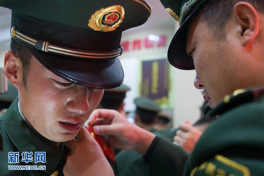 国旗护卫队队长徐文为魏凯(左)摘下肩章、领花和帽徽(11月30日摄)。新华社发(栗世民 摄)